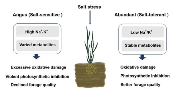 中国科学院武汉植物园草坪草与牧草分子育种学科组前期收集了多份多花黑麦草种质资源,并对其耐盐性进行系统评价。科研人员以前期筛选鉴定的极端耐盐(‘Abundant’)和盐敏感(‘Angus’)种质为材料,分别从生理生化水平和代谢水平对多花黑麦草耐盐机理进行解析。研究发现,与盐敏感种质相比,耐盐种质具有更高的叶片相对含水量和更好的牧草品质。进一步对抗氧化酶系统和光和系统进行比较研究发现,盐胁迫下耐盐种质活性氧诱导的细胞损伤较轻,且具有更高的光合效率。以上结果表明,与敏感种质相比,耐盐种质受到的盐毒害更轻。通过比较植物吸收和转运离子能力,科研人员发现和耐盐种质相比,盐敏感种质吸收钠离子更多且向地上部分转运能力更强,据此推测,吸收更少的钠离子,并抑制其向地上部分的转移是‘Abundant’耐盐机理之一。此外,从代谢水平比较分析‘Abundant’的耐盐机理,共鉴定到包括氨基酸、有机酸、脂肪酸和糖类在内的41种初级代谢产物。与耐盐种质相比,盐敏感种质‘Angus’代谢产物对盐胁迫更敏感。该研究为探究多花黑麦草的耐盐机制提供了基本信息。