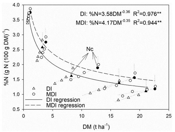 滴灌和膜下滴灌处理的玉米临界氮稀释曲线