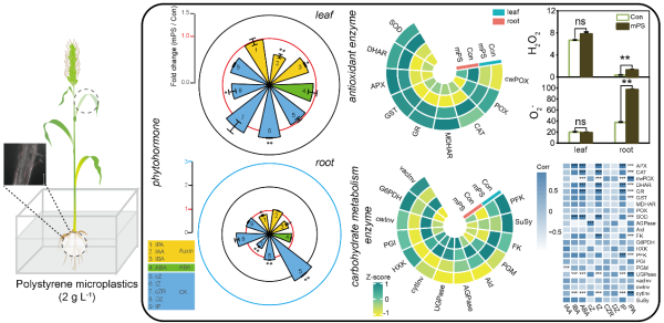 激光共聚焦显微镜观察发现,塑料微粒可以被大麦根系吸收。微塑料在根系中的积累导致根系H2O2和O2-含量升高。研究人员利用自主建立的归一化酶组学分析发现,微塑料显著增加了大麦根中脱氢抗坏血酸还原酶、谷胱甘肽还原酶、ADP-葡萄糖焦磷酸化酶、果糖激酶、磷酸果糖激酶活性,降低了细胞壁过氧化物酶、液泡转化酶、蔗糖合酶、磷酸葡萄糖变位酶、6-磷酸葡萄糖脱氢酶、磷酸葡萄糖异构酶活性,而塑料微粒对叶片中的碳水化合物代谢酶活性及活性氧代谢酶活性的影响与根系中的表现不同。此外,微塑料导致大麦叶片中反式玉米素含量升高,而吲哚-3-乙酸、吲哚-3-丁酸、二氢玉米素含量降低。研究人员还发现,碳水化合物代谢和活性氧代谢关键酶的变化与植物激素浓度具有显著相关性。研究结果表明,塑料微粒可严重影响作物碳代谢过程和激素调控网络,对作物生长发育产生直接影响。因此,未来研究中需更加重视塑料污染对作物生产的影响及其可能造成的生态安全问题。