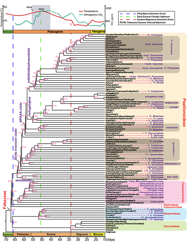 基于23个可靠的古老化石校准的估算分化时间显示,豆科的祖先起源于大约距今6700万年前,略早于白垩纪-古新世之交(Cretaceous-Paleogene boundary,K-Pg);该时期为“恐龙大灭绝”时期,是地球历史上的第五次以及最近一次大规模物种灭绝事件,大约五分之三物种在这一时期发生灭绝,包括裸子和蕨类植物等。在这次大灾难中,豆科是如何幸存下来并且繁衍成为被子植物最成功的类群之一呢?