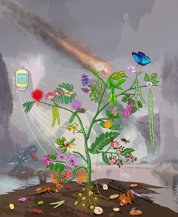 树的六个枝杈分别代表豆科的六个亚科:从左下到右上依次展示了甘豆亚科Detarioideae (Brownea grandiceps,Saraca dives)、紫荆亚科Cercidoideae (紫荆 Cercis chinensis, 羊蹄甲 Bauhinia blakeana)、山姜豆亚科 Duparquetioideae(山姜豆 Duparquetia orchidacea)、酸榄豆亚科Dialioideae (任豆 Zenia insignis) 、云实亚科 Caesalpinioideae(Chamaecrista fasciculata, 含羞草Mimosa pudica, 合欢Albizia julibrissin,朱樱花Calliandra haematocephala)和蝶形花亚科Papilionoideae (花生Arachis hypogaea, 羽扇豆Lupinus polyphyllus, 紫花苜蓿Medicago sativa,豌豆Pisum sativum,蚕豆Vicia faba,大豆 Glycine max,扁豆 Lablab purpureus,菜豆 Phaseolus vulgaris和豇豆Vigna unguiculata)。左上角输液袋以比喻手法展示了豆科主要分支的全基因组复制事件,其从下到上依次为豆科祖先,甘豆亚科,紫荆亚科,酸榄豆亚科,云实亚科,蝶形花亚科的最近共同祖先,均可能发生了多倍化事件。树的根部展示了豆科中的根瘤菌介导而产生的根瘤。图的时空背景显示:6500万年前,小行星撞击地球假说,产生了覆盖全球的尘埃云,全球气温急剧下降,导致包括恐龙的第五次物种大规模灭绝事件。地下散落的为豆科的花,果荚和种子,也展示了一些可能促进豆科传粉或者种子传播的有益有昆虫和动物。