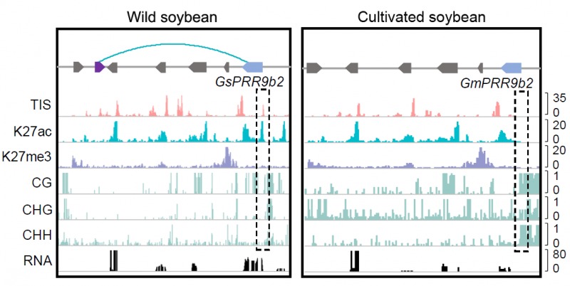 基因组多倍化(全基因组复制)是物种形成和进化的重要驱动力,在自然界中广泛存在。大豆(Glycine max)是典型的古多倍体,其祖先与菜豆(Phaseolus vulgaris)祖先分化后,又经历一次全基因组多倍化并伴随着缓慢的二倍化过程,导致近75%的基因以多拷贝形式存在。在约6000-9000年前的东亚地区,野生大豆被驯化为栽培大豆,其农艺性状发生显著改变。然而,在大豆多倍化、进化和驯化过程中,表观遗传在调控基因表达和重要农艺性状中的作用仍然知之甚少。