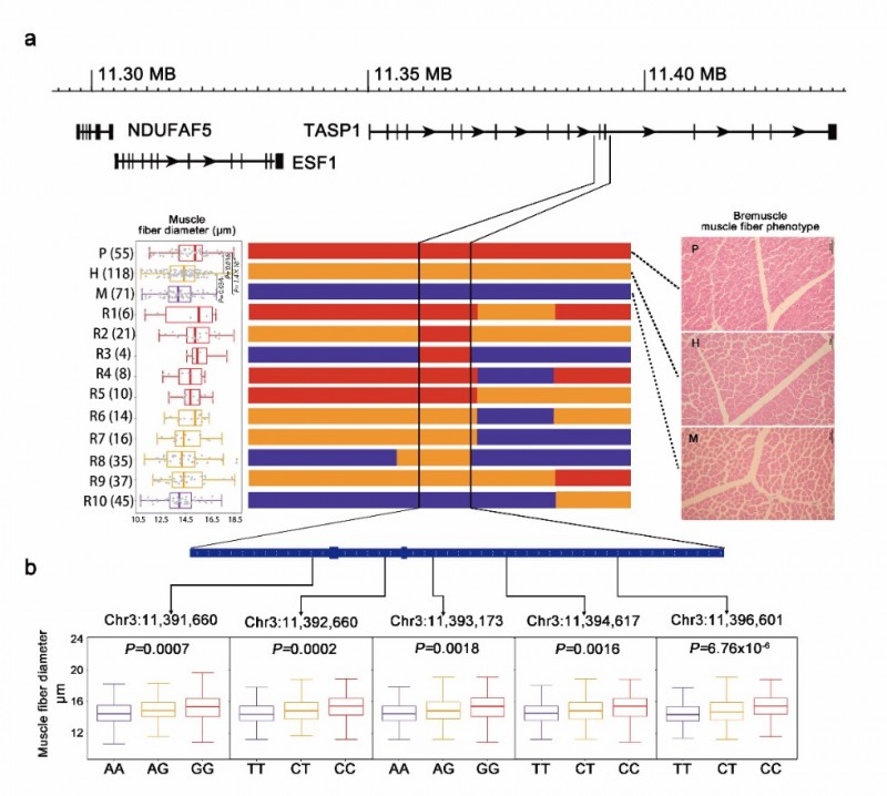 近日,中国农业科学院北京畜牧兽医研究所水禽育种与营养科技创新团队成功克隆了鸭胸肌肌纤维直径的主效基因TASP1,并阐明了该基因调控肌纤维发育的遗传机制。该研究不仅丰富了对鸭肌肉发育遗传调控的认识,还为肉鸭胸肌肌纤维直径选育提供了精准分子标记。相关研究成果在线发表在《遗传(Heredity)》上。