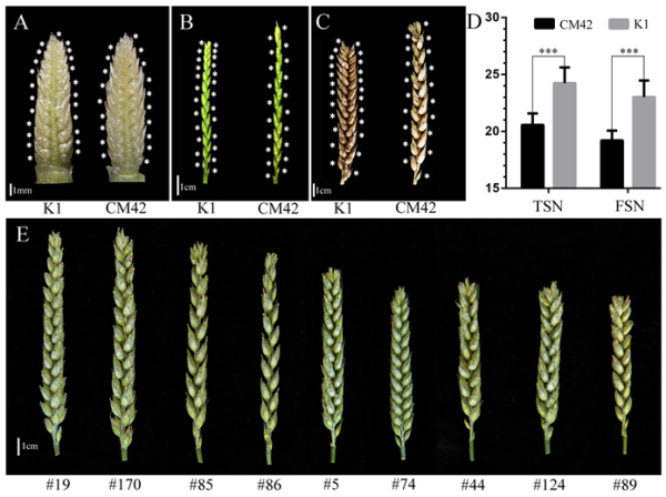 小麦(Triticum aestivum L.)作为最重要的粮食作物之一,是人们重要的能量摄入和蛋白质来源。我国是小麦生产和消费大国,培育高产小麦品种、不断提高小麦产量是保障我国粮食安全的重要措施之一。穗粒数是小麦产量三要素之一,与穗形态发育密切相关。小麦穗(spike)是由附着在穗轴两侧、交替互生的小穗(spikelet)构成。每个小穗包含数目不等的小花(floret),每个可育小花能够形成一个籽粒。因此,每穗小穗数和可育小花数决定了穗粒数,进而显著影响籽粒产量。揭示小麦小穗数形成的遗传基础,对于培育高产小麦品种具有重要理论及实践意义。