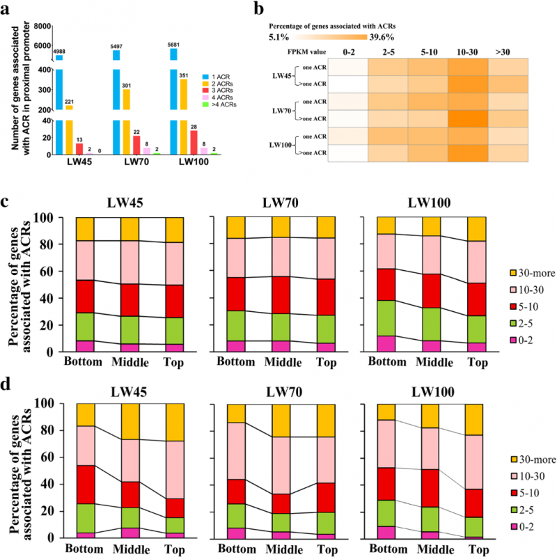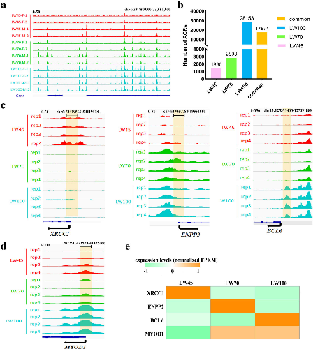 据团队执行首席张龙超博士介绍,猪胚胎肌肉发育主要集中在两个生长波,即胚胎期35-60天,初级纤维形成;胚胎期54-90天,次级纤维生成。发育过程中,大量转录因子通过与开放的靶基因DNA序列结合来调控基因转录的发生,进而控制骨骼肌发育进程。但由于猪胚胎期骨骼肌基因组范围染色质开放性尚不清晰,猪经济性状分子机理解析及基因组育种技术创新受到制约。为攻克这一瓶颈问题,研究人员以大白猪为研究对象,利用ATAC-seq、RNA-seq等多种组学研究技术,获得了包含45、70和100胚龄时期骨骼肌表观遗传调控数据,并在三个胚胎时期分别鉴定出21,638、35,447和60,181个染色体开放区域。研究还发现数个调控肌肉发育相关基因的转录因子以及大量转录阻遏物,为猪功能基因组及性状调控机制研究提供了重要参考。