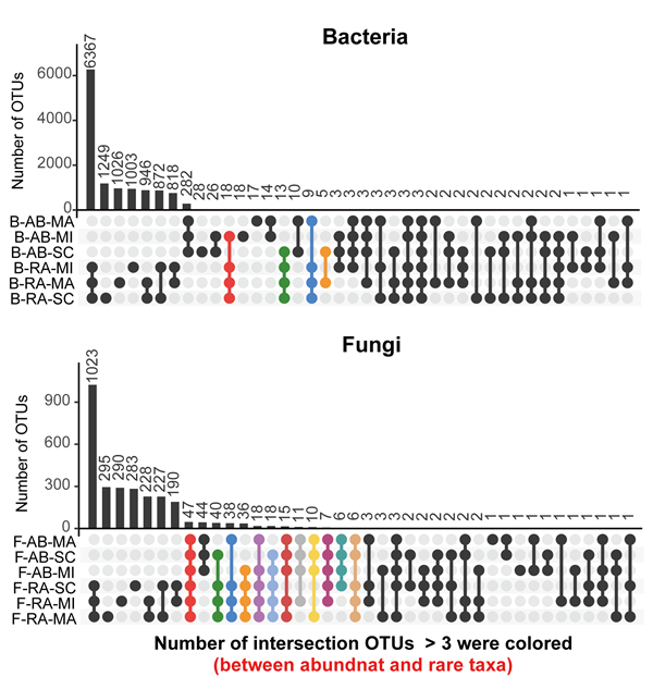 该研究基于白水苹果试验站的12年长期定位试验,调查了长期不施肥、单施化肥、生草覆盖、生草覆盖配合化肥4个处理下土壤不同粒径团聚体(> 0.25 mm;0.053-0.25 mm;< 0.053 mm)细菌和真菌群落结构,并对细菌、真菌的“丰富”和“稀有”菌群进行了群落装配分析。研究发现在丰富的细菌群落构建过程中,环境选择的重要性从大团聚体到小团聚体呈现增加的趋势。稀有细菌的群落装配过程受同质性选择影响,并且随着土壤有机碳和全氮含量的降低同质性选择的作用逐渐减弱。丰富真菌群落在团聚体中的装配过程主要受随机性过程主导,而稀有真菌群落主要受同质性选择和扩散限制共同主导。研究还发现,团聚体的发育团聚过程使丰富、稀有真菌和细菌群落结构趋于相似,但不同粒径团聚体的环境条件不同又会使其产生各自的独有菌种。而且丰富真菌、细菌可能是团聚体团聚的促进者,而稀有细菌可能是团聚体内功能的“种子库”。该研究为旱地苹果园长期生草覆盖与施肥条件下土壤肥力发育的微生物学机制提供理论依据。