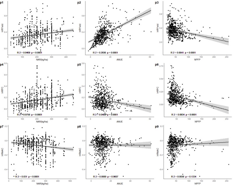 氮肥施用量、氮肥农学利用效率、氮肥偏生产效率与水稻产量、蛋白质含量、直链淀粉含量的效应值相关性分析结果