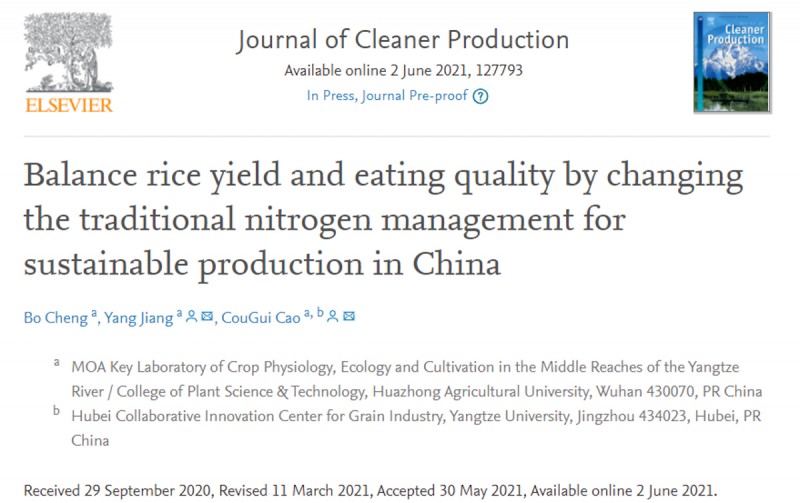 近日,华中农业大学农业生态团队结合meta大数据分析和田间控制试验验证的方法,对氮肥施用量和施用时期对稻米产量和品质的影响进行了综合分析,指出适当减少氮肥施用总量和减少氮肥穗粒肥施用量,能明显改善稻米食味品质并且不会影响产量。同时该研究对不同施肥条件下水稻氮素吸收、分配与稻米蛋白含量的关系进行了分析,提出提高氮肥农学利用率(ANUE)是获得水稻丰产和优质平衡的关键,为农业生产转型条件下水稻丰产美食味栽培的氮肥优化管理措施提供理论指导与技术支撑。该研究以“Balance rice yield and eating quality by changing the traditional nitrogen management for sustainable production in China”为题发表于Journal of Cleaner Production杂志 。