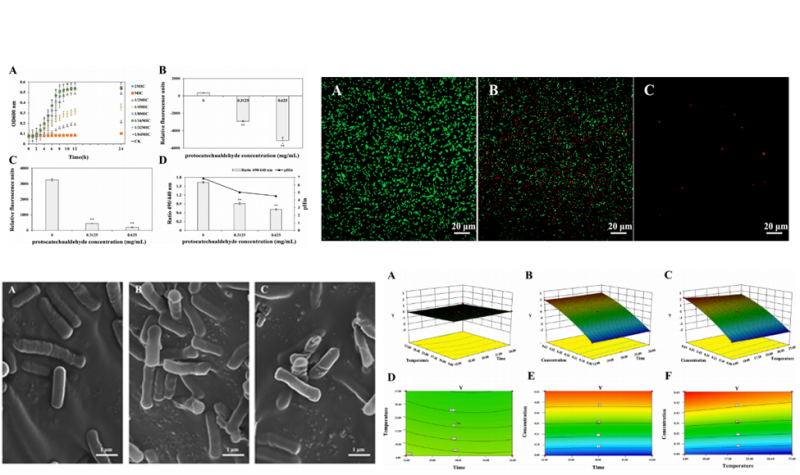 研究结果表明,原儿茶醛通过破坏胞质膜完整性,导致胞内环境紊乱、膜去极化和pHin降低,从而有效抑制小肠结肠炎耶尔森氏菌生长。质子梯度的动态坍塌和ATP池的耗尽可能是通过离子通道紊乱和膜上特定目标的破坏导致膜破坏的主要原因。原儿茶醛还能有效预防猪肉中小肠结肠炎耶尔森氏菌的污染。