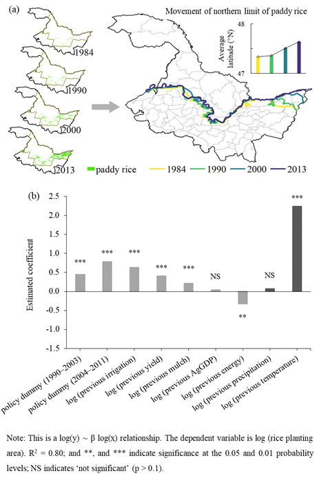 图:1984-2013年水稻种植空间分布及水稻种植北界空间分布(a图),水稻扩张驱动因素(b图)。
