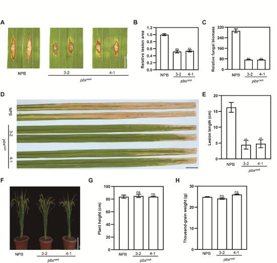 该研究通过CRISPR/Cas9 基因编辑技术对一系列感病基因进行了敲除,抗病表型分析发现敲除感病基因 Pi21 或 Bsr-d1 增强了对稻瘟病的抗性,敲除感病基因 Xa5 增强了对白叶枯病的抗性。为了创制广谱抗病新材料,该团队进一步同时敲除了 Pi21 、 Bsr-d1 和 Xa5 三个感病基因,发现三敲除材料 pbx 显著提高了水稻对稻瘟病和白叶枯病的广谱抗性。与对照相比, pbx 三敲除材料的株高和千粒重等农艺性状无明显变化。该研究通过CRISPR-Cas9技术编辑水稻多个感病基因成功创制广谱抗病材料,对水稻抗病分子育种和其它作物抗病性改良具有重要指导意义。