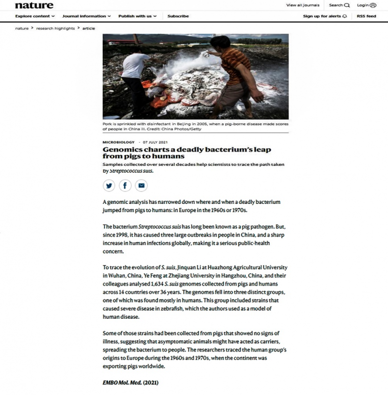 近日,华中农业大学李锦铨副教授研究团队在基础和转化医学EMBO Molecular Medicine上发表了题为“The global emergence of a novel Streptococcus suis clade associated with human infections”的研究论文,引起了领域内的高度关注。7月7日出版的Nature杂志将该成果评选为研究亮点(Research Highlights)并跟踪报道,从“One Health”的角度进一步肯定该研究工作的价值与意义。