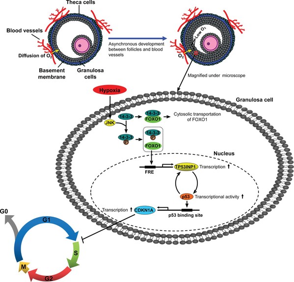 根据测序结果,本研究从差异基因中找到了一个极显著上调的候选基因TP53INP1。生物信息学分析显示,TP53INP1 基因启动子区存在FOXO1 的结合位点。利用采用荧光素酶活性分析、染色质免疫共沉淀(ChIP)等技术,研究证实TP53INP1是FOXO1靶基因。同时,TP53INP1 与p53 存在复杂的相互调控,一方面TP53INP1 是p53 下游靶基因,另一方面,TP53INP1 能够激活p53 活性,表现为对p53的正反馈调控。进一步通过ChIP、RNAi等技术探索FOXO1/TP53INP1/p53轴的机制及功能,结果表明:在低氧环境中,颗粒细胞FOXO1入核直接上调了其靶基因TP53INP1表达,进而激活p53,而p53作为调控CDKN1A表达的关键转录因子上调了CDKN1A表达,最终CDKN1A发挥细胞周期抑制功能引起颗粒细胞增殖阻滞。