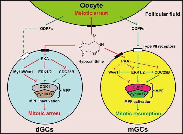 雌性动物出生后,卵母细胞一直停滞在减数第I次分裂前期的双线期。直至初情期到来后,在LH激素峰的作用下,减数分裂才能重新启动。早在上世纪80年代,美国科学院院士John Eppig教授发现卵泡液中含有抑制卵母细胞自发恢复减数分裂的小分子物质。次黄嘌呤(Hx)被证明是这些小分子抑制物中的主要活性成分,可通过抑制磷酸二酯酶的活性提高cAMP水平,抑制卵母细胞促成熟因子(MPF,即CDKl/cyclin B复合物)活性,从而维持卵母细胞减数分裂抑制。卵泡颗粒细胞与卵母细胞处于相同的卵泡环境中,颗粒细胞的增殖同样需要MPF活性,但次黄嘌呤对颗粒细胞增殖的影响却缺少报道。