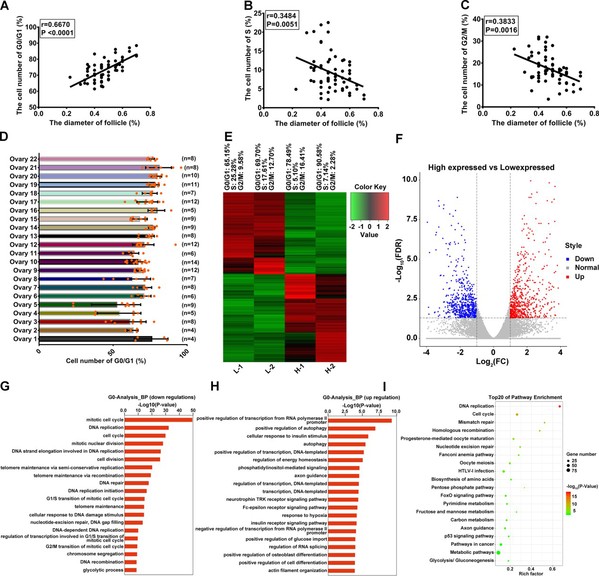 本研究采用流式细胞术检测了数百个猪有腔卵泡颗粒细胞周期,结果发现,随着卵泡直径的增加,卵泡颗粒细胞G0/G1 期比例显著升高。不仅如此,研究还发现,同样大小的猪有腔卵泡其颗粒细胞G0/G1 期比例也存在较大差异。试验剥取了近200 个直径4 mm 左右的猪卵泡,分离的颗粒细胞进行细胞周期检测,根据G0/G1 的比例,分为G0/G1 比例高组和G0/G1 比例低组,进行转录组测序分析。测序结果GO 分析发现,低氧应答是调控颗粒细胞G0/G1 阻滞的主要生物学过程。利用体外低氧模型,进一步证实低氧是诱导卵巢颗粒细胞G0/G1 阻滞,抑制颗粒细胞增殖的重要因素。
