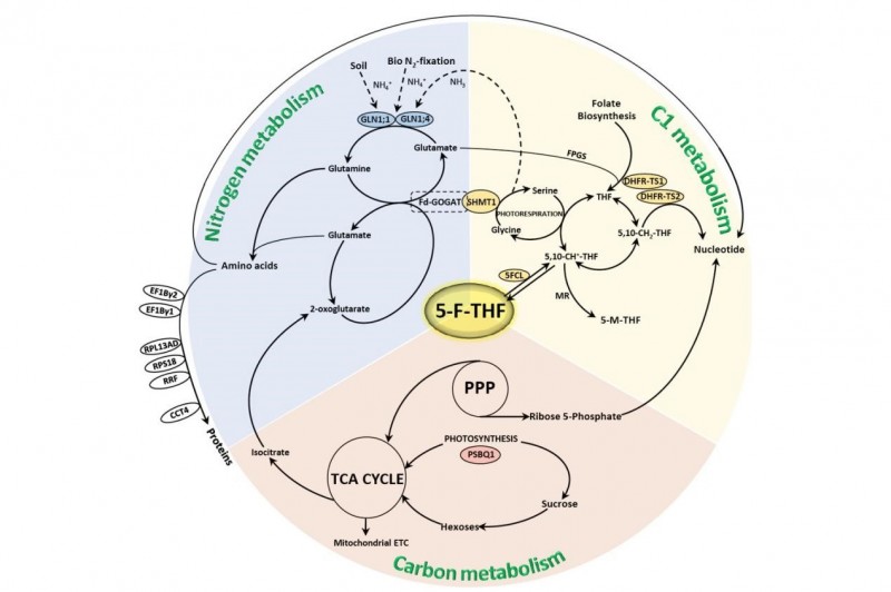 该研究通过构建具有生物学活性的叶酸分子探针,结合亲和蛋白质组学技术共鉴定了51个叶酸互作蛋白,并从中筛选出16个高亲和力互作蛋白和14个低亲和力互作蛋白。研究显示,叶酸分子通过与这些蛋白的互作将一碳代谢、碳代谢和氮代谢三条代谢途径联结在一起。上述结果从蛋白组学角度开拓了对叶酸生物学功能的认识,并在植物中分离得到叶酸互作蛋白,明确了叶酸分子深入参与植物碳代谢和氮代谢过程,为深入探索叶酸在植物发育中的作用机理奠定基础。