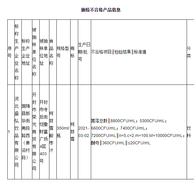 开封市荣光商贸有限公司销售的标称河北盛弘饮品有限公司生产的1批次柯菲雪酸枣汁,菌落总数检出值为8800CFU/mL、5300CFU/mL、6600CFU/mL、7400CFU/mL、7200CFU/mL,标准规定为5次检验结果均不得超过10000CFU/mL且至少3次检验结果不得超过100CFU/mL;酵母检出值为360CFU/mL,标准规定为不大于20CFU/mL。检验机构为河南省产品质量监督检验院。