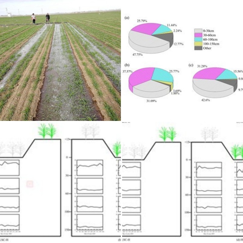 高低畦种植是一种新型栽培模式,具有较好的节水增产潜力。该模式在低畦灌水,高畦上的小麦通过吸收侧渗水分来满足耗水需求。该研究分析了土壤水、降水等不同水分来源的氢氧稳定同位素值,确定了冬小麦的根系吸水来源:冬小麦在生育期内主要利用0-60厘米的土壤贮水。对于灌溉定额为90毫米的灌溉,仅有69.07%的灌溉水贮会存在0-60 cm的主要根系吸水层中,超过30%的灌溉水会流失而难以被作物利用。因为灌溉深度要充分考虑与主要根系吸水层相匹配,该研究建议高低畦栽培模式下冬小麦的计划灌水深度不宜超过60 厘米。