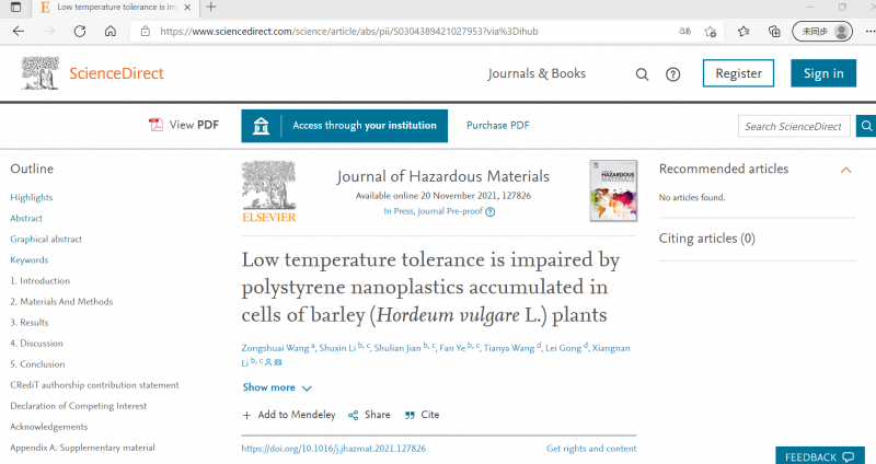 全球每年消耗大约2.45亿吨塑料,而其中91%的塑料产品未被回收。2016年,联合国环境大会将微塑料问题等同于全球气候变化等全球性重大环境问题。在高投入农业中,塑料制品的大量使用,使塑料颗粒容易进入土壤环境,而作物可以通过裂纹侵入模式吸收塑料颗粒,从而受到塑料颗粒的影响,不利于自身生长。然而,对于塑料颗粒如何影响作物低温抗性仍研究较少。为此,科研人员以大麦为研究对象,针对纳米塑料颗粒影响大麦低温抗性生理机制开展了相关研究。