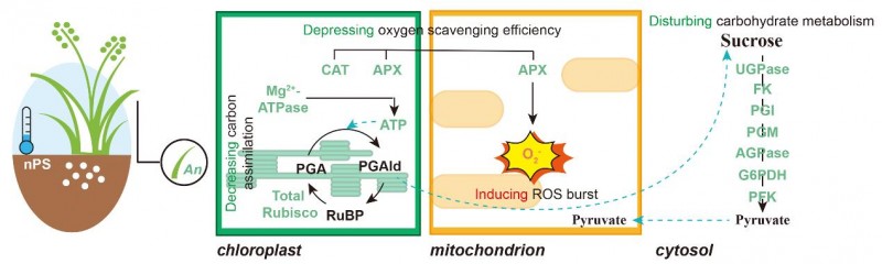 利用荧光显微镜观察发现,经荧光标记纳米塑料处理的大麦植株叶片的原生质体中具有荧光,表明纳米塑料进入植物细胞。在低温胁迫下,纳米塑料颗粒处理的大麦植株叶片具有更小的净光合速率。进一步提取叶绿体后发现,纳米塑料颗粒处理降低了Mg2+-ATPase和核酮糖-1,5-二磷酸羧化酶/加氧酶(Rubisco)活性,引起ATP 含量下降。以上结果表明,纳米塑料颗粒处理干扰了低温胁迫下大麦的光合碳同化,加剧了能量物质失衡。接下来,研究人员对植物糖酵解过程进行了研究,发现纳米塑料颗粒处理降低了低温胁迫下大麦叶片中UDP-葡萄糖焦磷酸化酶(UGPase)、ADP-葡萄糖焦磷酸化酶(AGPase)、磷酸葡萄糖变位酶(PGM)、磷酸葡萄糖异构酶(PGI)、6-磷酸葡萄糖脱氢酶(G6PDH)、果糖激酶(FK)、磷酸果糖激酶(PFK)活性,进一步扰乱植物碳水化合物代谢。该试验还通过提取叶绿体和线粒体,在亚细胞水平上对低温和纳米塑料颗粒引起的氧化胁迫进行了研究。研究表明,纳米颗粒引起了低温胁迫下植物叶片线粒体中活性氧(ROS)的累积,并且使叶绿体中过氧化氢酶(CAT)、抗坏血酸过氧化物酶(APX)以及线粒体中APX活性降低,降低ROS清除效率。
