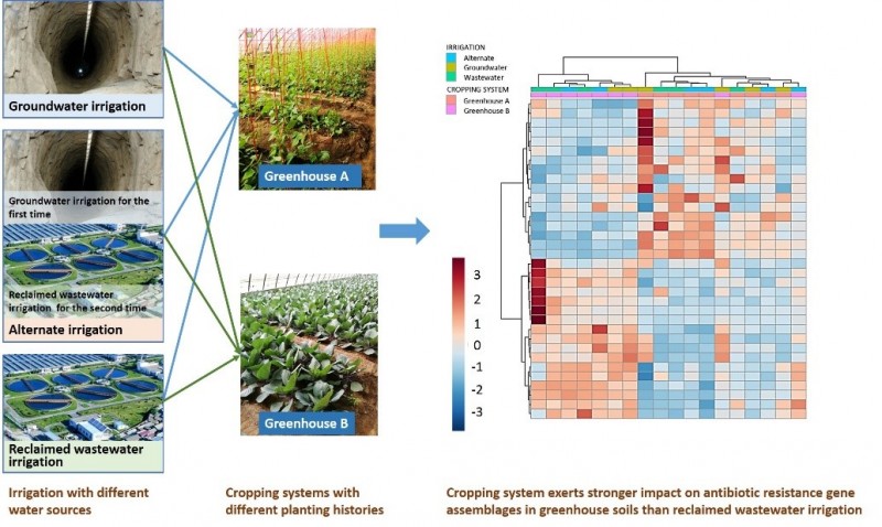 抗生素抗性基因(Antibiotic Resistance Genes,ARGs)广泛存在于再生水中,因此,使用再生水灌溉是否会影响ARGs在土壤中的传播扩散备受关注。已有研究往往缺少严格对照,大多未考虑对作物的影响,同时缺少长期试验数据论证,且结论存在不一致现象。鉴于此,该团队利用宏基因组技术,以具有16年再生水灌溉历史且种植模式不同的两个温室土壤为研究对象,考察了再生水灌溉和种植模式对ARGs的影响。结果表明,各灌溉处理方式(地下水灌溉、再生水灌溉、地下水再生水交替灌溉)对土壤ARGs组成无显著影响,而种植模式则显著影响了ARGs、重金属抗性基因、生物杀灭剂抗性基因、插入序列和微生物群落组成。研究结果为再生水的安全利用提供了理论依据。
