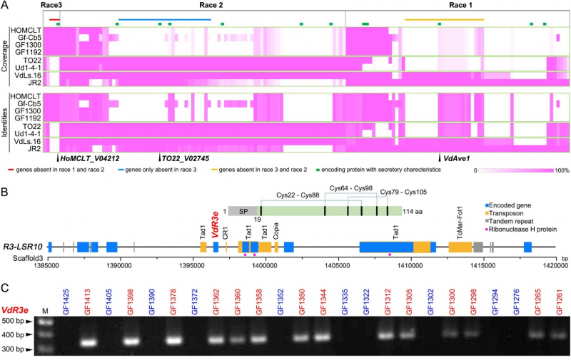 本研究在系统解析大丽轮枝菌3个生理小种基因组及其遗传变异的基础上,发现大丽轮枝菌3个生理小种的信号调控因子(转录因子)发生了显著分化,同时各个生理小种相对于其他2个生理小种均有基因家族发生扩增;通过对3个生理小种基因组特异基因集的筛选与遗传学验证,鉴定出3号生理小种无毒基因( VdR3e ),并在此基础上研发了大丽轮枝菌3号生理小种分子检测技术。相关研究拼上了大丽轮枝菌生理小种种群分化和无毒基因鉴定的重要“版图”,也为农业生产实践中大丽轮枝菌生理小种监测和寄主抗性资源挖掘与应用提供了重要的理论和技术支撑。
