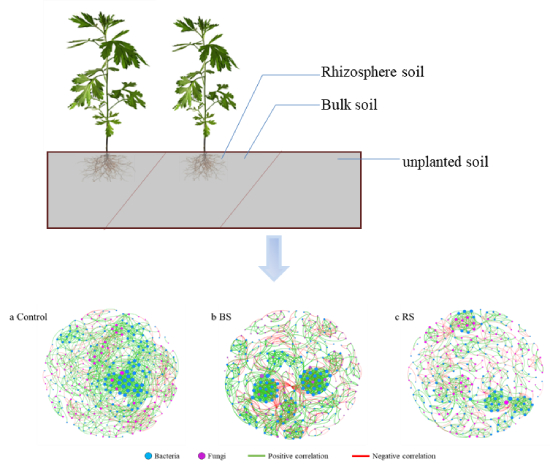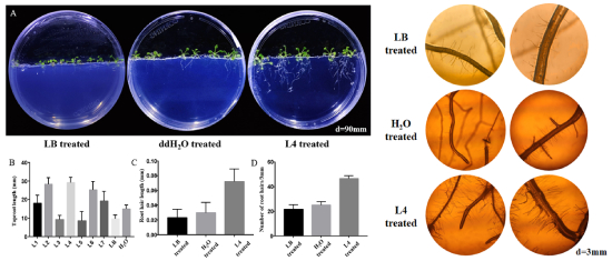 该研究通过对有七年黄花蒿种植历史的土壤取样,分析根际和非根际土壤细菌与真菌群落结构,发现鞘氨醇单胞菌与鞘脂菌两种植物促生细菌以及腐生性真菌在植物根际的富集。黄花蒿根系组装的特殊微生物网络,能够增强细菌与真菌的界间互作,以提升植物环境适应性。研究人员又进一步从黄花蒿根际土壤中成功分离11株植物促生功能菌株。其中,林可链霉菌菌株 Streptomyces lincolnensis L4定殖的植株,在主根长度与直径以及根毛数量等方面显著增加。同时,植物根系中多个根发育相关基因的表达分析确认了链霉菌菌株对于根发育的调节功能。