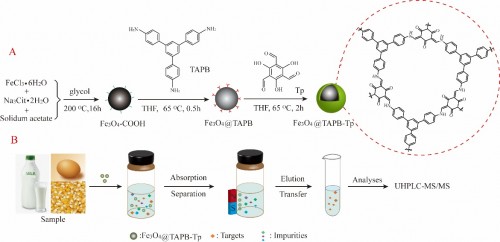 在食品安全高灵敏检测方向,团队在检测新材料研发领域取得新突破。由于食品基质复杂,有害物含量低,需要高效的富集净化材料实现高灵敏检测,但传统吸附材料制备条件苛刻、吸附容量低,难以实现有效富集与净化。团队在70 ℃温和条件下研制出新型磁性多孔有机材料Fe3O4@COF (BAPTPDA-Dt)、Fe3O4@TAPB-Tp和Fe3O4@PDA@UPOPs,键合了脲类等多种官能团,赋予其丰富的疏水性及亲水性,使其吸附能力大大提升。其中,新材料Fe3O4@TAPB-Tp用于牛奶中玉米赤霉烯酮富集净化,所建立的高效液相色谱-串联质谱法的定量限可达0.012 μg/kg,与《食品安全国家标准 食品中玉米赤霉烯酮的测定》(GB 5009.209-2016)规定的方法定量限4 μg/kg相比,灵敏度提高了数百倍。这些新材料实现了制备条件温和、吸附容量高等技术突破,检测灵敏度从ppb向ppt级跨越,实现食品中多种痕量有害物的高灵敏检测。