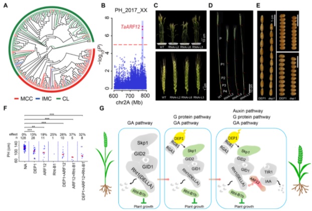 该团队通过梳理过去近百年的中国小麦育种历史,结合分子标记收集,筛选到287份具有广泛遗传多样性的微核心种质材料。研究人员以上述287份国内微核心种质为材料,结合11个重要农艺性状,从育种选择、农艺性状遗传基础、多性状协同改良、优异位点聚合、后绿色革命中赤霉素路径的育种选择修饰等方面对国内小麦育种改良工作的分子遗传基础进行了全面解析。通过对育种过程中主要农艺性状的协同改良研究,获得一批“降低株高-增加粒重”、“降低株高-缩短开花期”以及“缩短开花期-增加粒重”的协同位点。“降低株高-增加粒重”、“降低株高-缩短开花期”的协同优异位点在栽培种中的比例逐渐增加,且在育种年代中呈现逐渐累积的过程。研究结果表明现代育种改良通过G蛋白路径和生长素路径等多通路协调互作的模式对赤霉素路径进行选择修饰与精细调控,以实现后绿色革命时代新的高产目标。