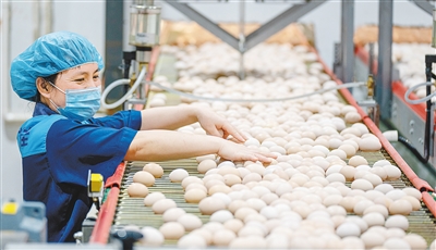 在蛋品车间里,10余名工人忙碌地打包鸡蛋。“鸡蛋自动化分拣后,我们不需要费力挑选、分类,只需做一些装箱、打包等简单的工作。”工人金小文说。