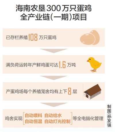 走入鸡舍,恒温恒湿的环境凉爽舒适;点击按钮,智能给料系统迅速填满料槽;自动清理,鸡粪被机器传送烘干制成环保有机肥……3月20日,在位于澄迈县福山镇的海南农垦300万只蛋鸡全产业链(一期)项目现场,一幅生动的智能化养鸡场景在海南日报记者眼前展开。