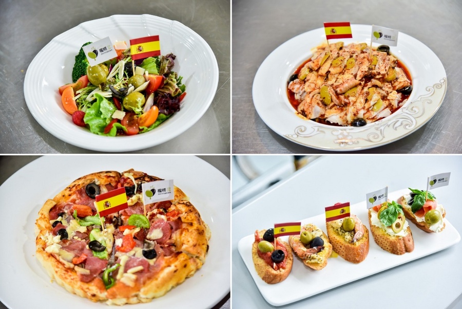 实践课的授课老师是四川旅游学院烹饪学院的老师,在他们的带领下,学生们将在实践课上学到的新知识,运用到具体的烹饪中,制作出了西班牙橄榄Tapas,西班牙橄榄披萨,西班牙橄榄沙拉以及西班牙橄榄怪味鸡丁这几道菜肴。