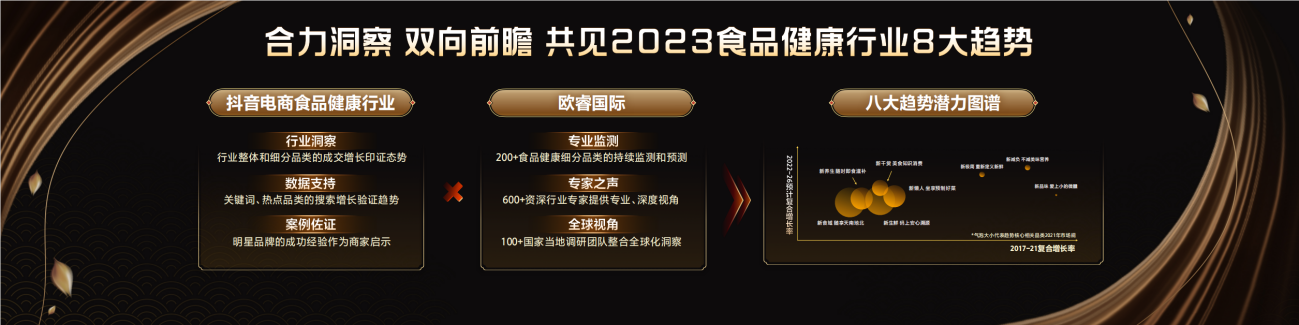 当前,大众对食物的需求越发多元、细分,健康、美味、尝鲜、方便、满足社交及情感需求等都能够成为消费者选择产品时的重要关注因素。准确洞察消费趋势,并以此做好生意布局规划,是商家生意经营中的重要举措。为帮助商家洞悉最新消费趋势及行业发展动态,抖音电商食品健康行业联合欧睿信息咨询公司在会上共同发布《2023年度食品健康行业趋势洞察报告》(以下简称“报告”)。