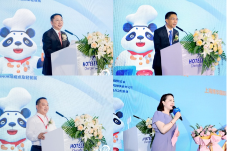 四川省旅游饭店业协会书记、常务副会长鲍小伟、成都餐饮企业联合会会长柏林、四川省清洁服务行业协会会长刘英勇和上海博华国际展览有限公司常务副总经理范海燕在开幕式上致辞