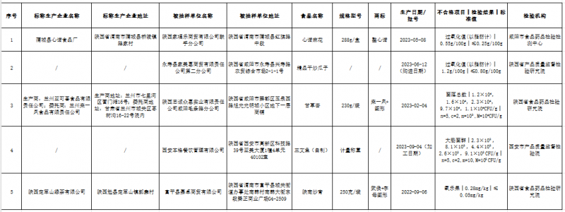 11月9日,陕西省市场监督管理局发布2023年第35期通告,检出不合格食品5批次,涉及质量指标不达标、微生物污染、农药残留超限值的问题。