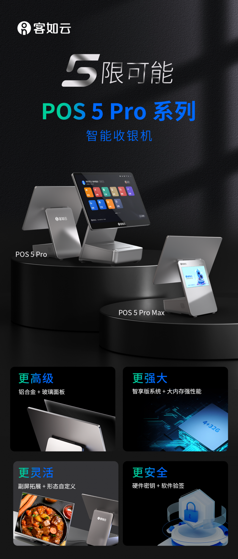 同时,客如云还不断优化软件SaaS的算法和升级系统,不断提升SaaS解决方案的稳定性和安全性,确保餐饮企业数据的完整性和安全性。今年3月初,客如云2024年度全新产品POS 5 Pro系列发布,客如云2款全新智能收银设备POS 5 Pro & POS 5 Pro Max,为数字化智能收银系统带来变革式升级,全新POS 5 Pro系列可以与不断迭代升级的客如云“智享版餐饮管理系统”无忧搭配,搭建起强大的「系统底气+硬件硬气」为广大餐饮商家服务。