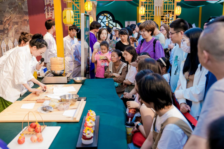 “食在杭州”展区以其美食文化的深度融合,向游客展示了杭州餐饮业的深厚底蕴。这里不仅有葱包烩、油墩子等传统杭帮小吃,更有方老大的陈皮鸡爪、福缘居的脆皮大肠、杭州酒家的南方大包等热门美食一一亮相,它们以其独特的风味,吸引了大量游客不惜排起长队,只为一饱口福。上城的知味小笼、拱墅的康桥烧鸡、西湖的老鸭煲、滨江的红烧肉、萧山的萝卜干、余杭的径山茶飨、临平的粢毛肉圆、钱塘的欢牛蛋糕、富阳的油面筋和龙门牛肉、临安的茴香饼、石笋干和天目暖锅、桐庐的米粿、淳安的安上粉皮、建德的豆腐包和三都麻糍等13个区县特色美食也在活动中热销。一天之内,拱墅康桥烧鸡卖出300多只,萧山桔红糕1小时售罄,淳安的千岛湖鱼肉小笼包售出100笼,临平复昌粢毛肉圆卖掉了1500多个……现场人潮涌动,场面火爆。米其林大厨的现场表演也是展会一大亮点。每天定时的绝活展示,不仅让游客们大开眼界,更有机会免费品尝均价百元以上的精致菜肴,让美食爱好者大快朵颐。