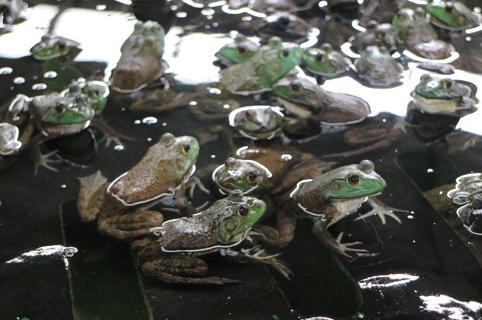 走近大江富地牛蛙养殖基地,便听到阵阵蛙声此起彼伏。只见百余亩的蛙池依序排开,黑色的遮阳网下,个个嫩绿的牛蛙映入眼帘,一只只、一排排,放眼望去,满目青绿,一派生机勃勃的景象。