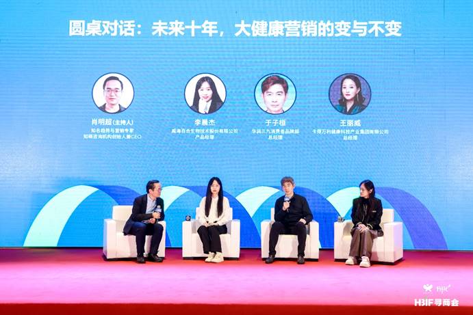 首日的圆桌讨论由知萌咨询机构肖明超主持,威海百合生物李晨杰、华润三九于子桓、卡得万利王丽威三位嘉宾围绕”对流量红利消退后,健康品牌如何构建长效竞争力以及AI是否将重塑健康消费体验两大问题进行圆桌讨论。