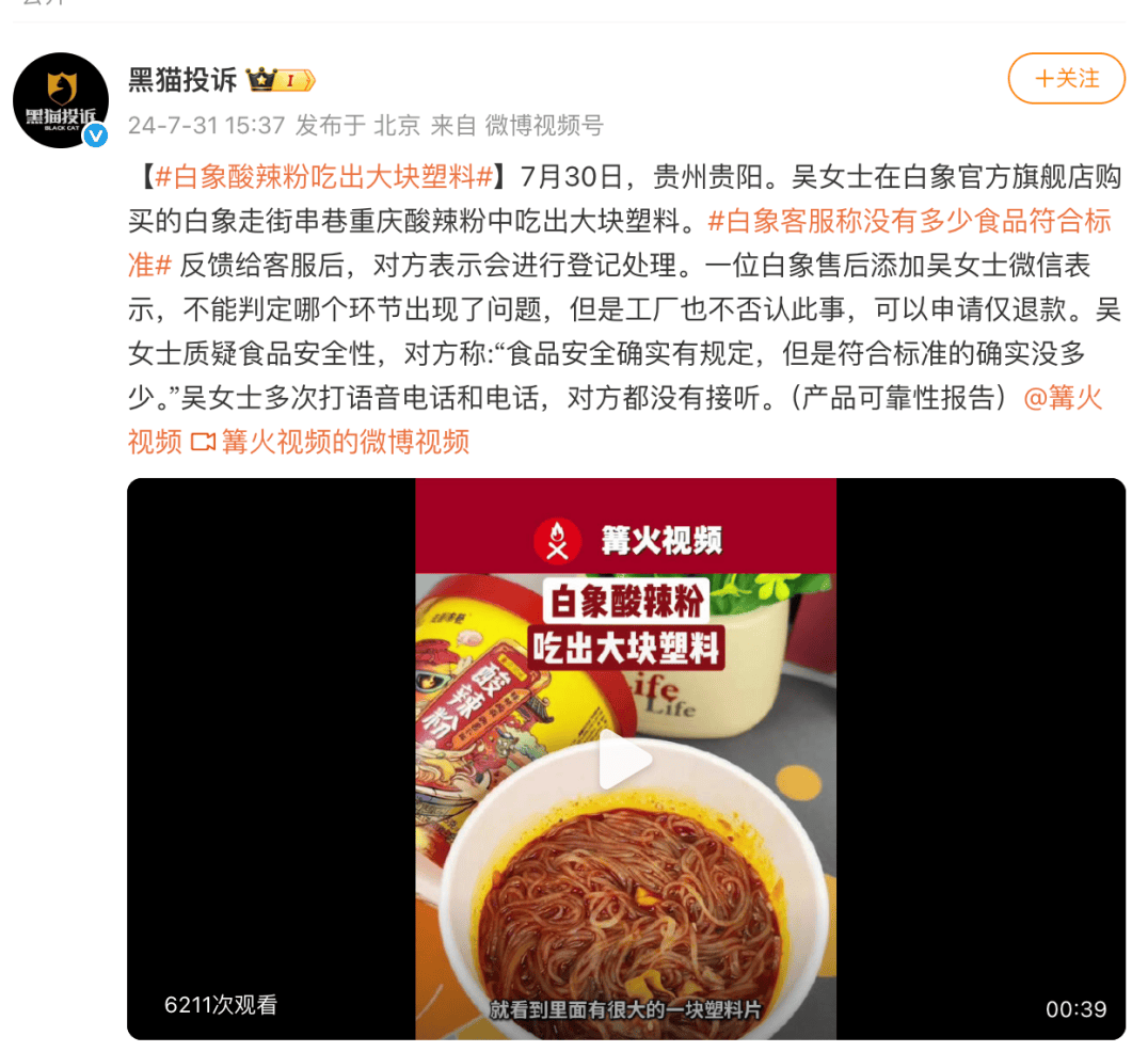 投诉量只增不减?触目惊心的品控乱象早已不是白象面临的孤例。黑猫投诉平台上堆积如山的消费者控诉只增不减——酱包不明渗漏、面饼暗沉发黑、食品中惊现不明异物,甚至清晰可见的虫子尸体,这些都成了投诉榜单上的高频词。更令人心惊的是投诉量的爆炸式增长轨迹。