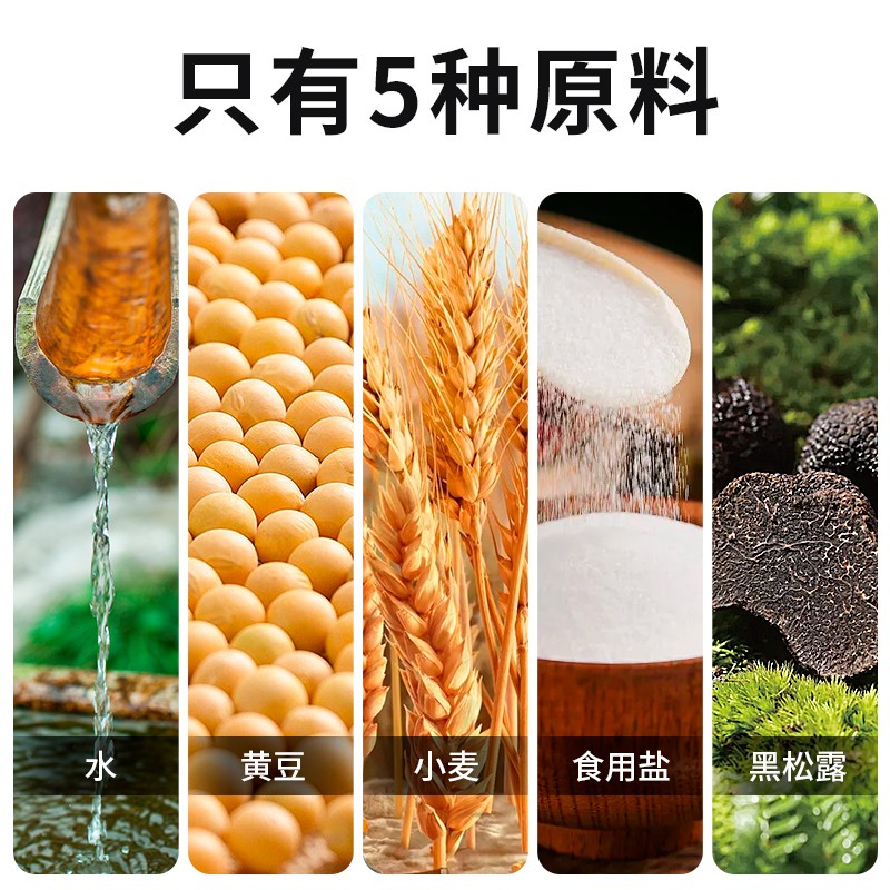 黑松露熟酱油是经过煮熟工艺处理的酱油,且原料构成精简仅5种(水、黄豆、小麦、食用盐、黑松露)健康属性突出。其精准锁定佐餐场景,在配方研发阶段就确立了“突出食材本味”的核心目标,将优质黑松露精华与传统煮熟的酱油基底科学融合,形成层次分明的风味体系。