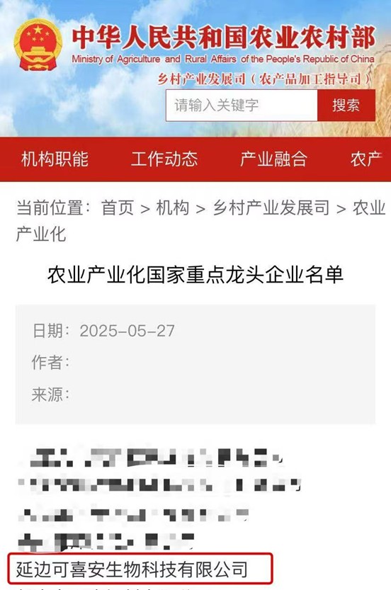 近日,中华人民共和国农业农村部公示《农业产业化国家重点龙头企业名单》,延边可喜安生物科技有限公司上榜。这是延吉市农业产业化发展的重要里程碑,也标志着可喜安生物科技跨上新的台阶,跻身国家农业产业战略布局梯队。