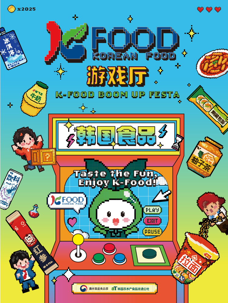 活动采用像素风游戏主题概念,打造六大特色体验区:"面面俱到美味攻略战"体验拉面、零食与冰淇淋的创新组合配方;"福饮盲选冲刺战"抽取当日心情的饮料、茶饮及乳制品;"参能量分贝大作战"感受人参功效;"未来食验室"展示具有韩国特色及出口潜力的创新产品;"K-Food待机室"融合复古与潮流的主题拍照区;"K-Food零食库"与京东韩国馆联动的购物体验区。