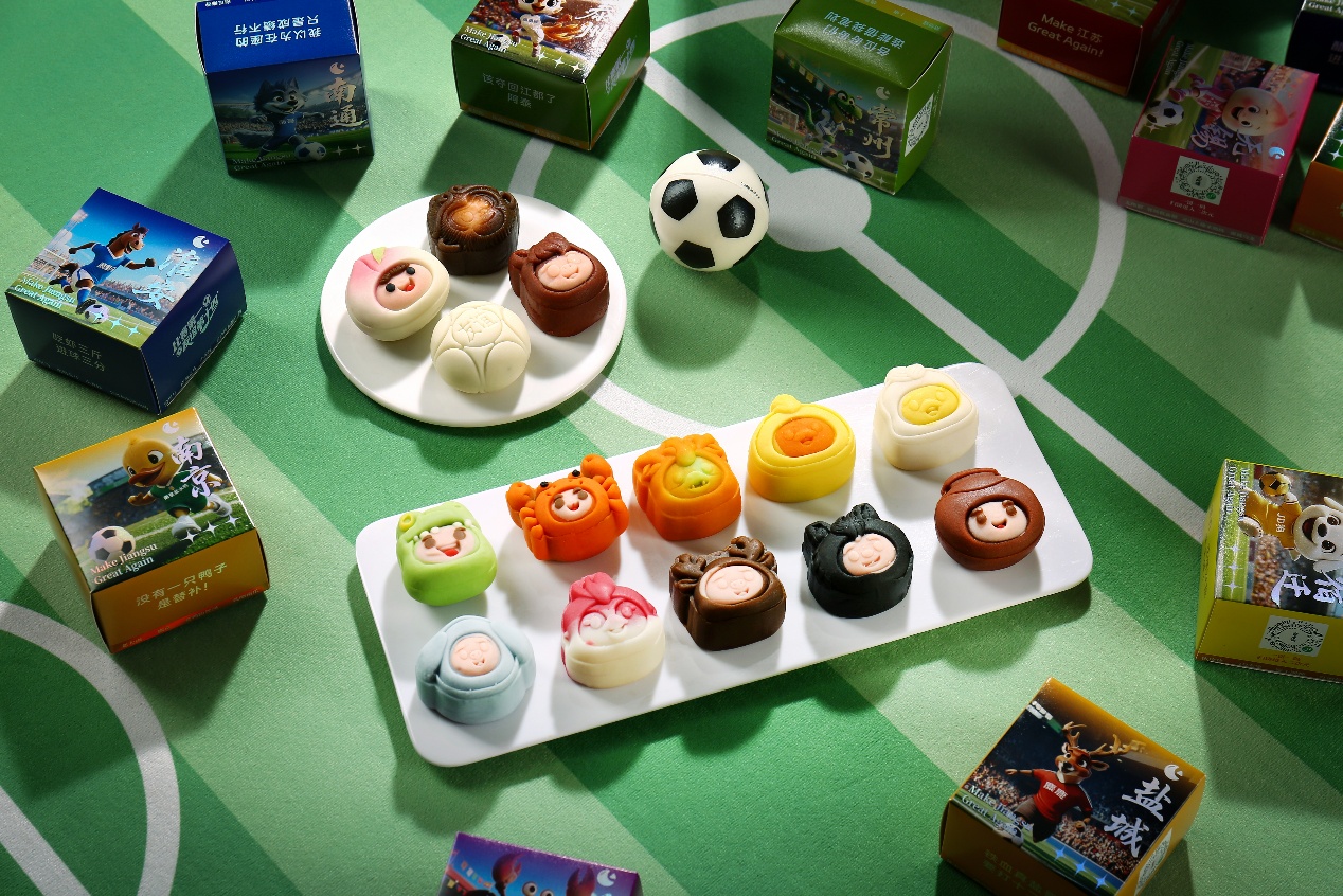 视觉与设计上,以 “足球 + 城市” 为核心灵感,用 14 款吉祥物造型月饼(覆盖江苏 13 座参赛城市及 1 款 “友谊第十四”)连接传统与创新。命名、造型与食材均做了针对性创新:造型上融入 13 座城市的卡通形象;食材上遵循 “药食同源” 理念,采用低糖低脂工艺,与传统月饼形成差异化;命名则紧扣城市特色与苏超梗,如 “浪里马(芸沙枸杞淮山药月饼)”“徐老大(蛋黄肉松月饼)”“苏得起(碧螺春茶月饼)” 等,为每座参赛城市定制趣味标签,进一步提升产品话题性。