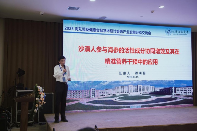 大连工业大学食品交叉科学研究院院长谭明乾教授带来了题为《沙漠人参与海参的活性成分协同增效及其在精准营养干预中的应用》的重要报告。谭教授的研究独具匠心,从“沙”到“海”,将 沙漠人参肉苁蓉的“沙”与辽宁海参的“海”进行深度融合。 他的报告深入解析了肉苁蓉核心活性成分(如苯乙醇苷类)与辽宁海参特征活性物质(如海参皂苷、多糖等)之间的潜在协同增效机制,揭示了二者复配可能产生的“1+1>2”的生物学效应。该研究为开发基于肉苁蓉-海参复配、具有明确功效指向性的精准营养干预产品提供了坚实的科学依据和创新思路,是推动地方特色资源高值化利用的典范。