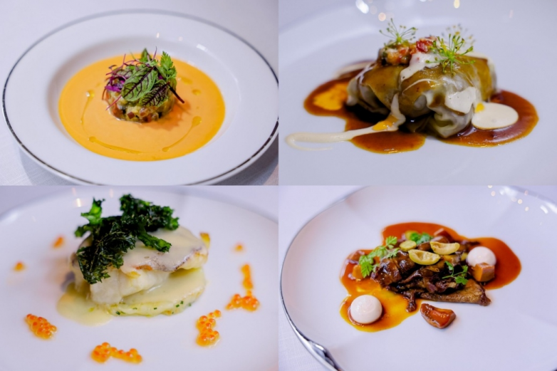 主菜呈现了西班牙橄榄在海鲜与肉类间的多面性:西班牙青橄榄冷汤配鲜虾牛油果沙拉与芽苗菜,清爽而层次分明;牛颊肉云吞佐慕尼耶酱,酱汁丝滑、肉香浓郁,橄榄的咸味成为点睛之笔;蒜香橄榄石斑鱼配青柠杏仁土豆泥,将海味的清新与坚果香气连结;而以青橄榄、蘑菇与法式酸奶油收尾的小牛舌,则在奶香与风味平衡中显得格外耐人寻味。整套主菜在口感张力与风味平衡上拿捏得恰到好处,既保留了主厨的创意标识,也尊重食材本味。