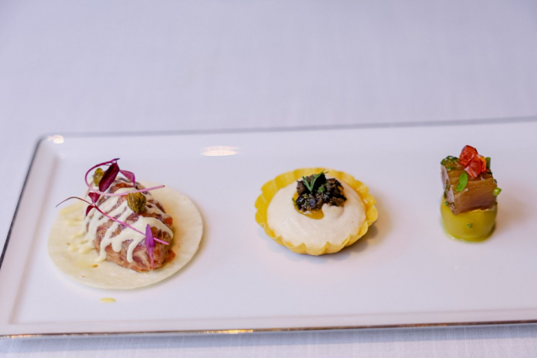 当晚菜单由精致前菜拉开序幕:金枪鱼鞑靼被填入饱满西班牙大青橄榄,配以蒜香蛋黄酱与风干番茄,鱼肉的鲜嫩与橄榄的清咸形成优雅对话;鳕鱼布兰达塔塔搭配西班牙黑橄榄与杏脯,咸甜交织,质地细腻;以牛里脊与西班牙橄榄蛋黄酱为核心的塔可,配上香煎水瓜柳,将肉质的多汁与西班牙橄榄的风味巧妙平衡,为后续菜肴铺垫了良好节奏。配酒方面,陈酿卡瓦的气泡感很好地清洁味蕾,衔接各道前菜。