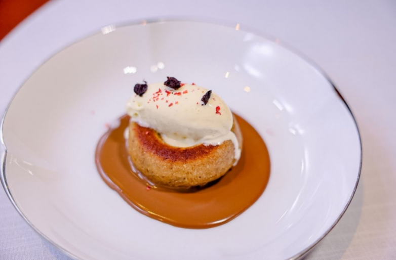 餐后甜点西班牙黑橄榄海绵蛋糕——黑巧克力熔浆浓郁而丝滑,香草冰淇淋冰凉而香甜;在甜与苦、冷与热的对比中,西班牙黑橄榄的独特风味绽放在食客的味蕾中,为整场晚宴画下一个令人回味的句点。