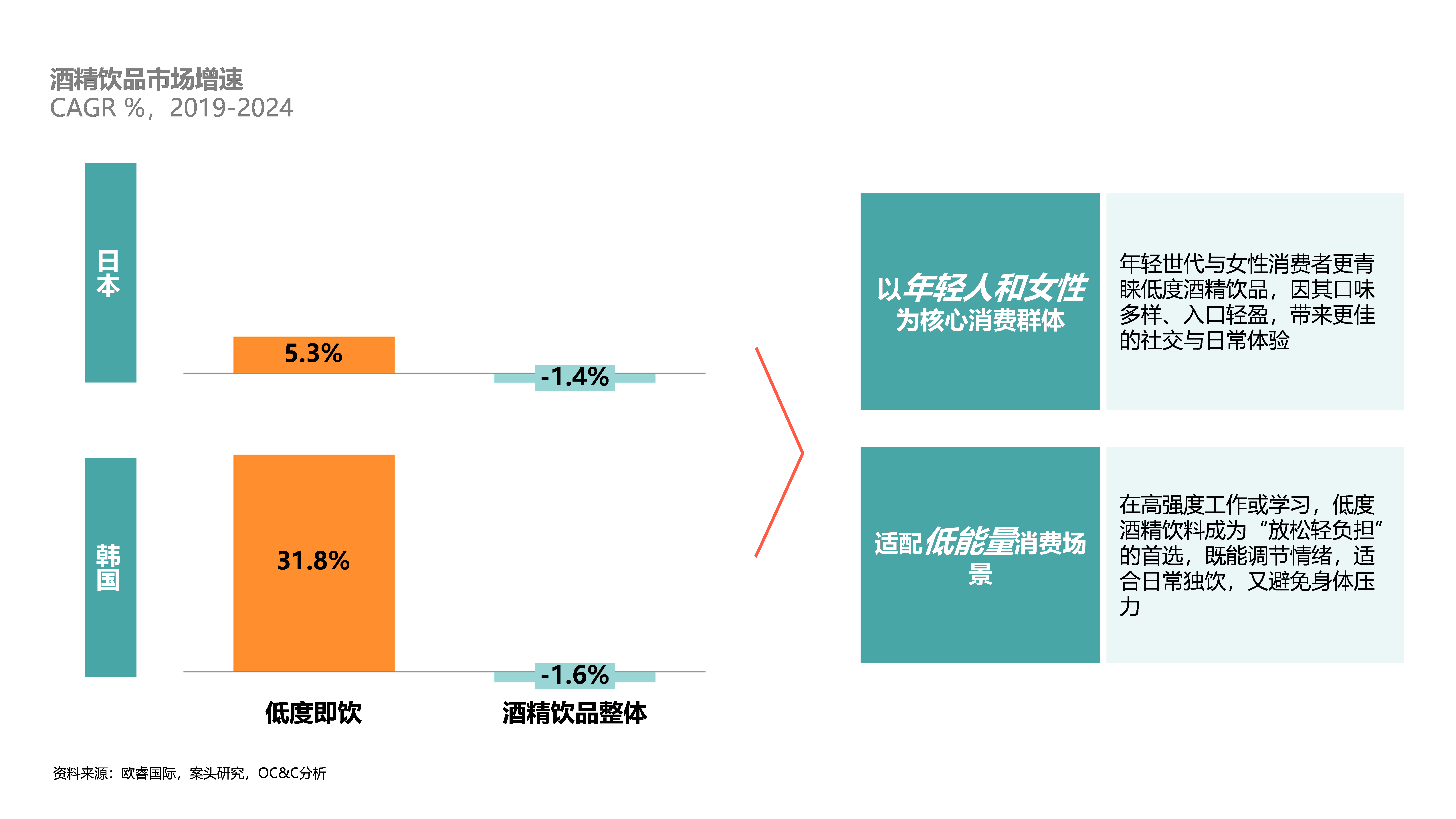 因而,低浓度即饮酒近年在日韩等地受到追捧,它们酒精含量适中,口感丰富,更适合年轻人日常小酌,成为舒缓情绪,放松压力的新选择。同时,添加GABA等舒缓成分的饮料产品也日益增多,通过抑制中枢神经过度兴奋,对情绪、压力、疲劳与睡眠都有积极作用。