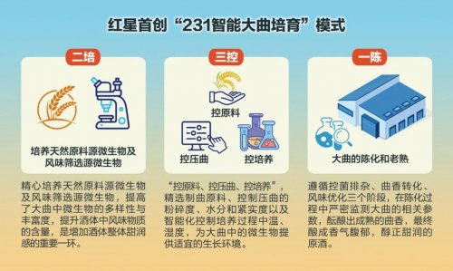“入口甜润感突出,中段绵柔不刺激,尾韵清爽留甘”,第八代红星二锅头能赢得酒友们的如此赞誉,离不开红星首创的“231智能大曲培育”模式——两培、三控、一陈,酿出了第八代红星二锅头独有的“甜润”。